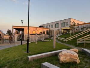 Sporafjell barnehage opna i januar 2024, og me husar i dag 164 barn i eit nytt og framtidsretta bygg med åtte avdelingar. Både bygg og organisering sikrar kvalitetane i det nære, samstundes som organisasjonen er robust nok til å handtere dei utfordringane kvardagen byr på. I tillegg til avdelingsromma har bygget to fellesrom som inviterer til fysisk aktivitet, eit bibliotek og eit vassrom som avdelingane disponerer til faste tider kvar veke.